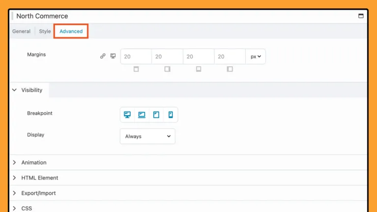 Adjust margins for spacing, set visibility rules by device type, and apply animations for dynamic user experiences. You can also add custom code with advanced CSS and Javascript settings. These options give you full control over your content’s display and allow precise tailoring to your design needs.